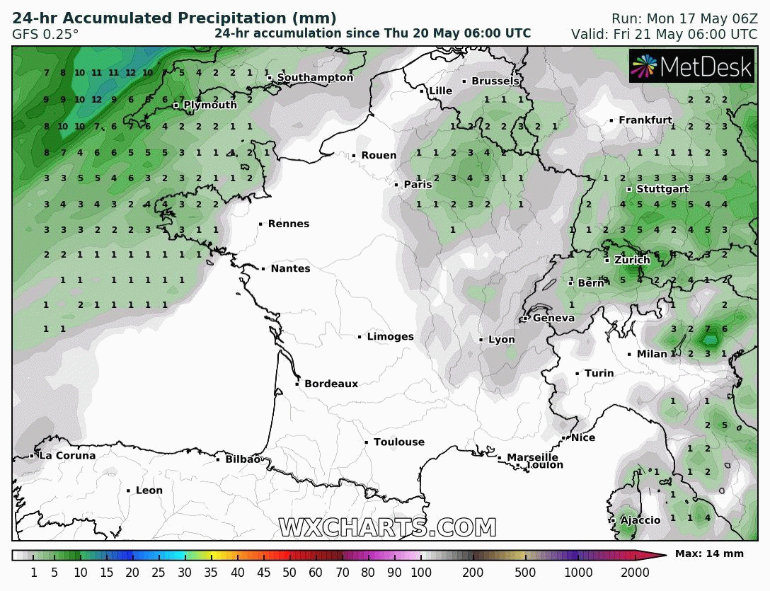 Le répit ne s’annonce que très temporaire car le courant océanique perturbé devrait reprendre dès ce vendredi 21 mai 2021 et ce jusqu'en début de semaine suivante. Un nouveau défilé de pluies et averses devrait s'opérer sur une grande majorité du pays, accompagné d'une fraîcheur de nouveau marquée pour la saison, de façon similaire à ce que nous connaissons en ce début de semaine du 17 au 23 mai 2021.
