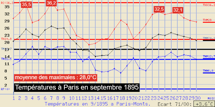 Séptembre 185 : un exemple de vague de chaleur tardive... Températures mesurées à Paris-Montsouris - via meteo-climat-bzh