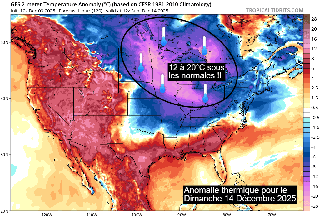 Il ne fait pas beaucoup plus chaud dans le nord du continent américain et particulièrement au Canada, où l'hiver a débuté sur les chapeaux de roue. Ces dernières heures, le thermomètre s'est abaissé sous les -40°C dans de nombreuses localités des Territoires du Nord-Ouest. On a pu mesurer jusqu'à -46,5°C sur la Dempster Highway et -44,7°C à Fort Good Hope ! Et ce froid glacial est loin d'être terminé puisqu'une nouvelle coulée polaire se prépare pour la fin de semaine sur le Canada et le nord-est des USA. Ce dimanche 14 décembre 2025, on attend -25°C à Minneapolis et -30°C dans le Dakota du Sud !
