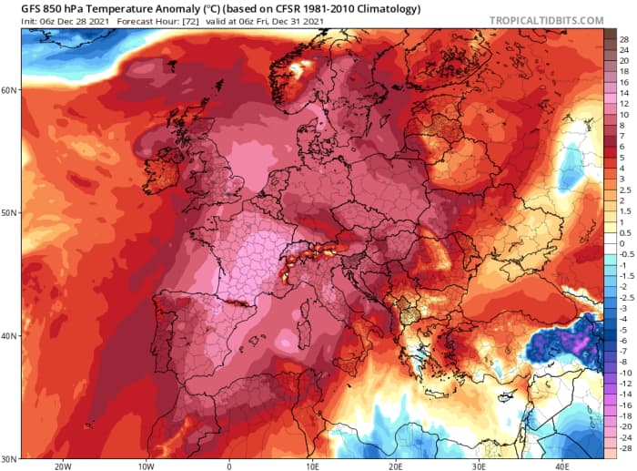 Anomalies thermiques de la masse d'air pour le vendredi 31 décembre 2021 - via tropicaltidbits.com