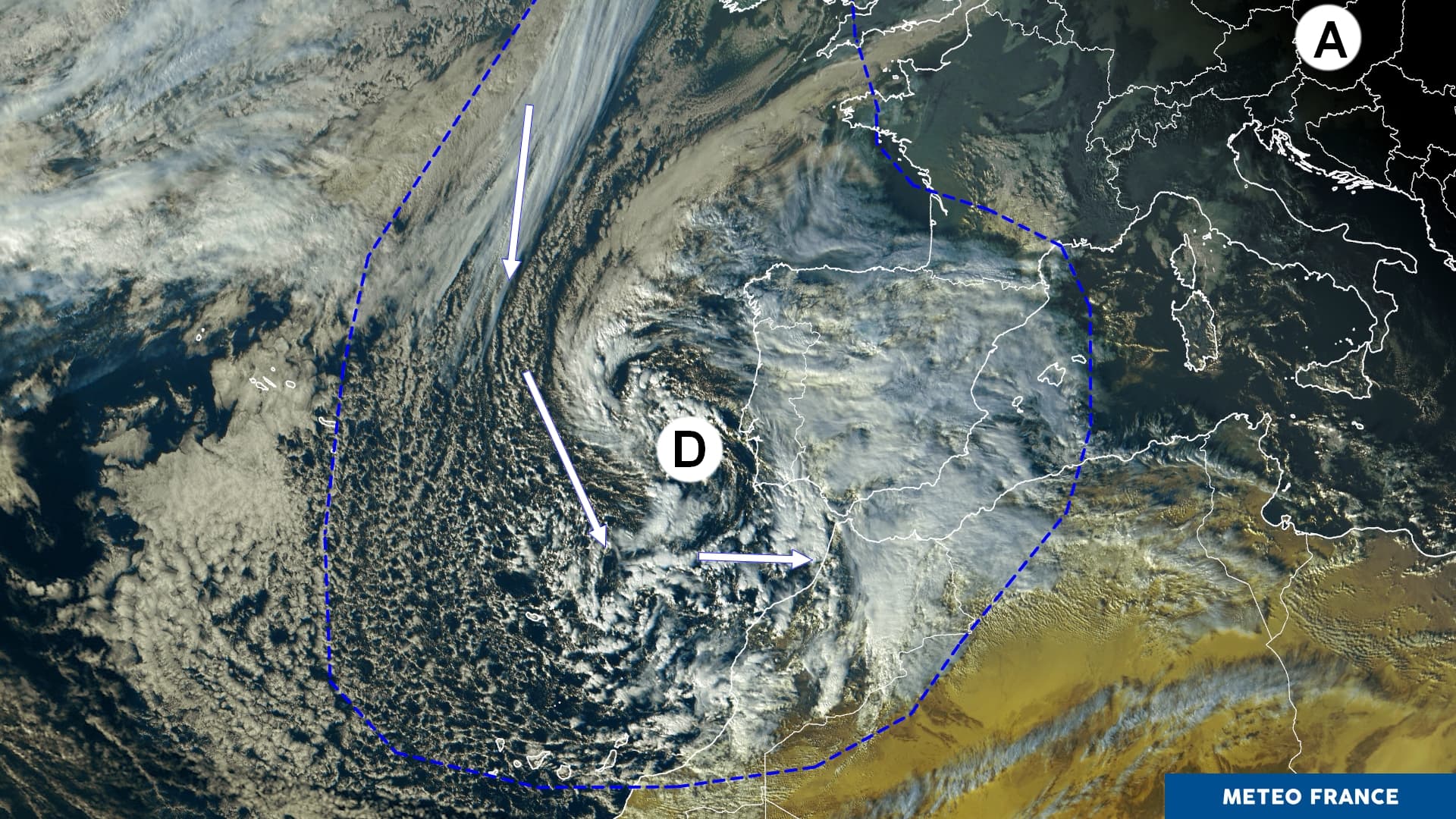 Image satellite du 26 Novembre montrant l'avancée de la zone dépressionnaire sur la péninsule ibérique et le Sud-Ouest de la Méditerranée - Météo-France