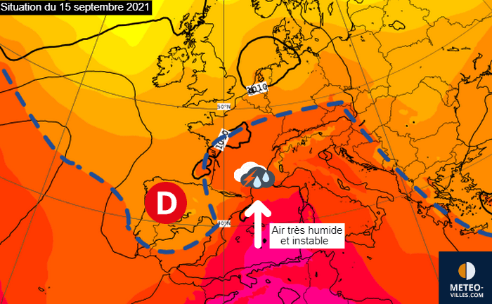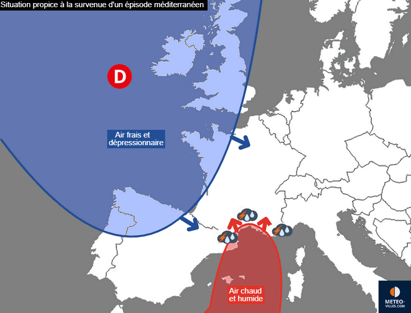 Avec l'affaissement de l’anticyclone des Açores vers le Sud à la fin de l'été, les dépressions ont plus de facilité à se propager vers l'Ouest de l'Europe et la France et donc apporter un temps plus ou moins perturbé sur une large partie du pays. Néanmoins, c'est prêt de la méditerranée que ce type de situation est la plus à risque.