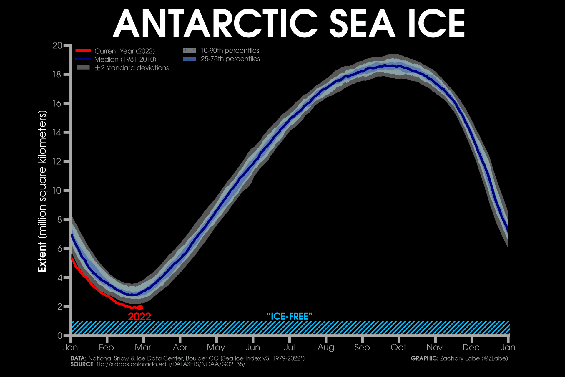 La banquise antarctique atteint généralement son minimum annuel à la fin de l'été austral, soit entre la mi-février et le début du mois de mars avec une moyenne de 2,80millions de km² sur la période 1981-2010. Le record bas était jusqu'à présent détenu par l'année 2017 avec un minimum annuel de 2,17 millions de km² le 3 mars.