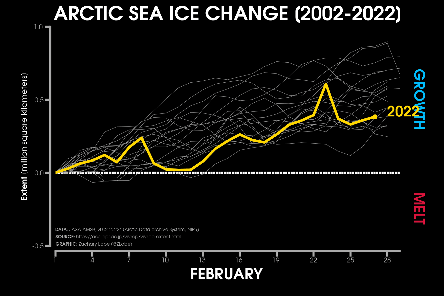 Évolution de la banquise arctique durant le mois de février 2022 – Zachary Labe – JAXA