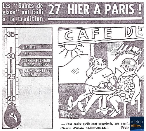 Même plus de 50 ans en arrière, les Saints de Glace étaient parfois synonymes de chaleur. Ce fut notamment le cas les 12 et 13 mai 1969 où une pulsion d'air chaud particulièrement impressionnante envahissait l'ensemble de la France. Le thermomètre était alors monté jusqu'à 29°C à Paris le 13 mai tandis qu'il faisait 31°C dans le Poitou et localement jusqu'à 33°C en Aquitaine ! On se baignait sur de nombreuses plages françaises, y compris sur les côtes de la Manche.