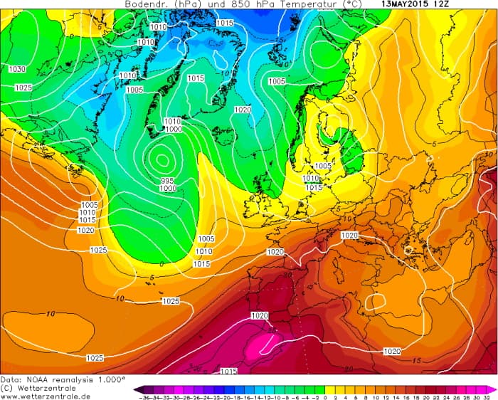 Masse d'air à 850 hPa le 13 mai 2015 - via Wetterzentrale