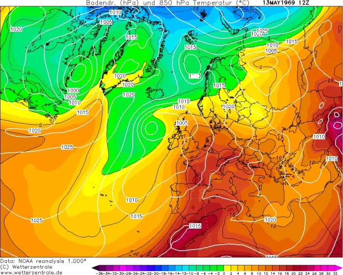 Masse d'air à 850 hPa le 13 mai 1969 - via Wetterzentrale