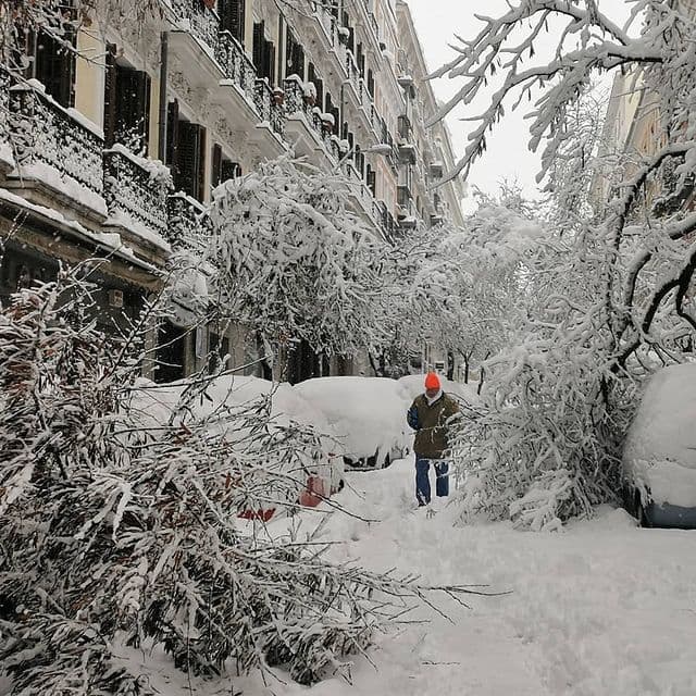 Avec de telles quantités, la végétation a particulièrement souffert. Sous le poids de cette neige, d'innombrables arbres ont plié voire cassé en plein cœur de la capitale Ibérique.