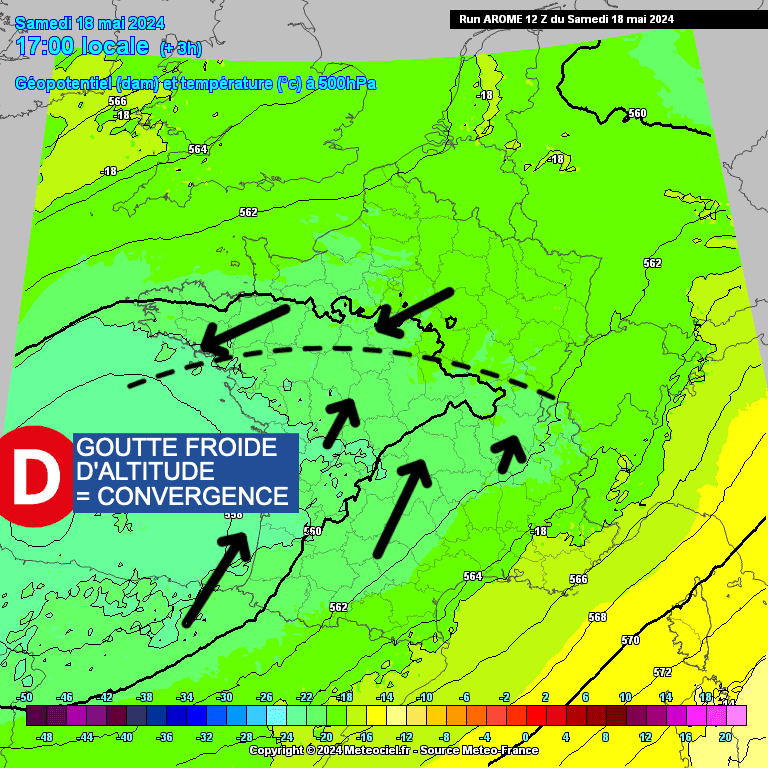 Nous sommes en deuxième quinzaine de mai, et une goutte froide concerne la France. Au centre, il n'y a pas de flux d'altitude particulièrement fort.