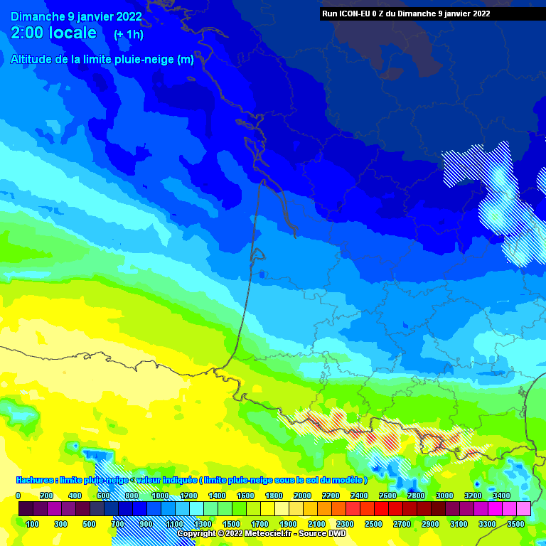 Altitude de la limite pluie-neige - dimanche 09 et lundi 10 janvier 2022 - Modèle ICON-EU via Météociel