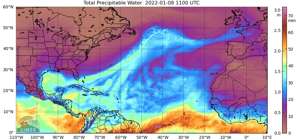 Contenu en eau précipitable de la masse d'air - 08 et 09 janvier 2022 - CIMSS