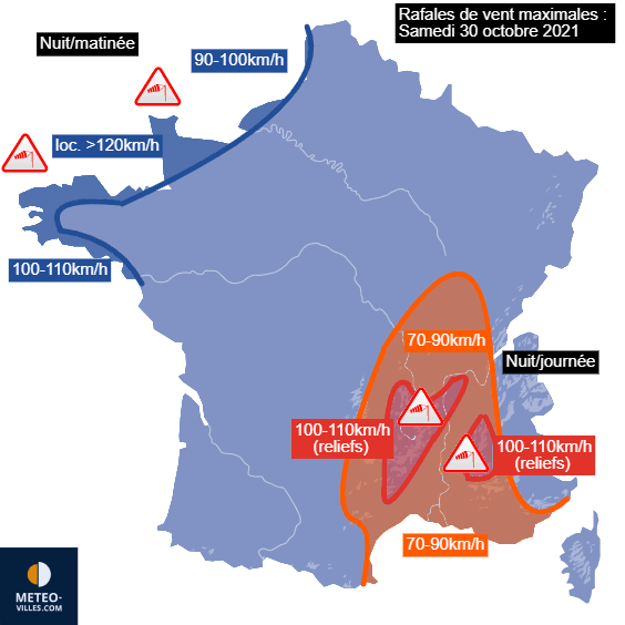 Rafales de vent maximales attendues entre la nuit du vendredi 29 octobre et la journée du samedi 30 octobre 2021 - Météo-Villes