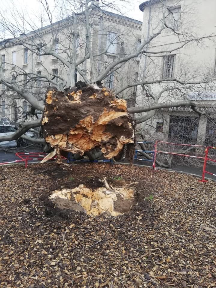 Outre les pluies, c'est le vent qui fait parler de lui sur les littoraux, avec des rafales dépassant les 100km/h sur les côtes Varoises mais également sur les plages Languedociennes. L'Hérault a notamment été placé en vigilance orange pour ces vents tempétueux, ayant atteint les 107km/h à Sète ou encore 104km/h du côté de l'aéroport de Montpellier. Sous ces vents violents, un arbre remarquable n'a pas résisté dans le centre-ville de Montpellier.