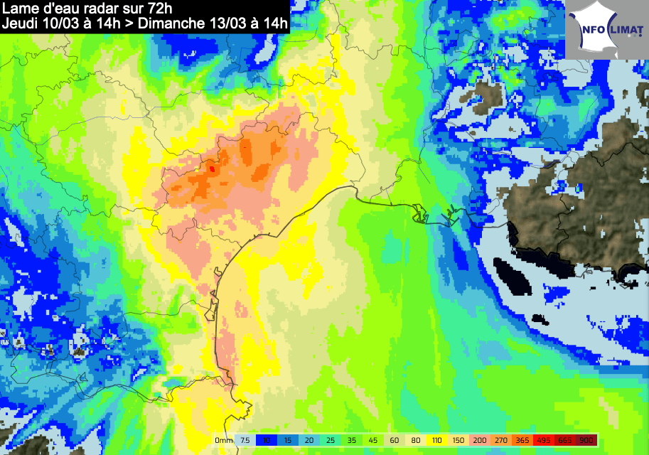 Lame d'eau radar sur 72h (du jeudi 10/03 à 14h jusqu'au dimanche 13/03 à 14h) - Infoclimat