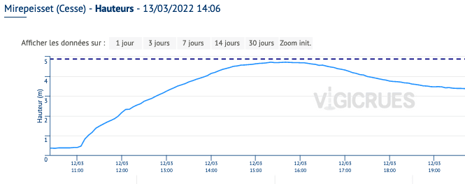 Hauteur d'eau de la Cesse sur la commune de Mirepeisset (Aude) - 12 mars 2022 - Vigicrues