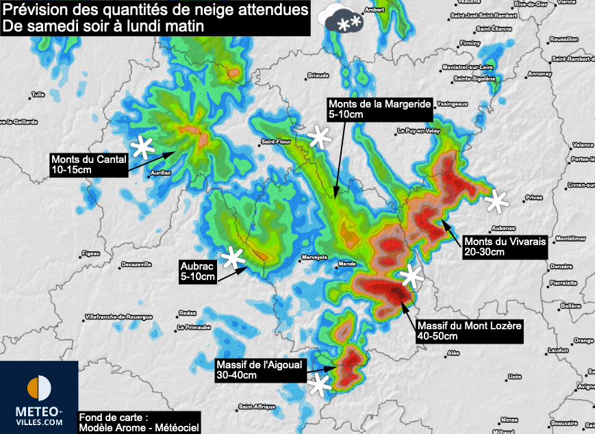 Outre ces pluies, la neige va continuer de tomber en abondance sur le Sud du Massif-Central sur la soirée de samedi et l'ensemble de la journée de dimanche, notamment dans le Massif de l'Aigoual (30-40cm), du Mont Lozère (40-50cm) ou encore sur les Monts du Vivarais (20-30cm). Une dizaine de centimètres supplémentaires sont également plausibles sur les plus hautes altitudes de l'Aubrac, des Monts du Cantal ou encore de la Margeride.