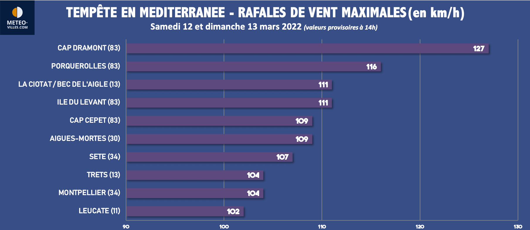 Rafales de vent maximales en Méditerranée (samedi 12 et dimanche 13 mars)
