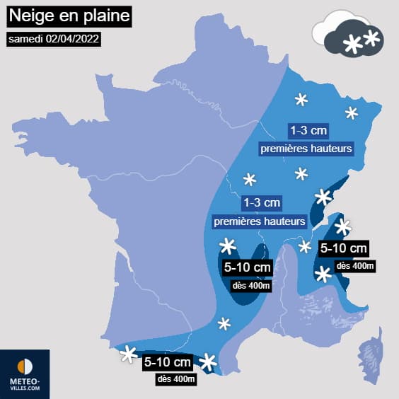 Dans la nuit du samedi 2 avril 2022, les précipitations neigeuses circuleront notamment vers le Massif Central et les Pyrénées où elles pourront tomber jusqu'en plaine (y compris jusqu'au piémont pyrénéen) mais aussi dans l'est de la France, du Grand-Est jusqu'à Rhône-Alpes. Durant la journée de samedi, elles faibliront graduellement au fil des heures et la neige deviendra fondante (ou mêlée de pluie) aux altitudes les plus basses.
