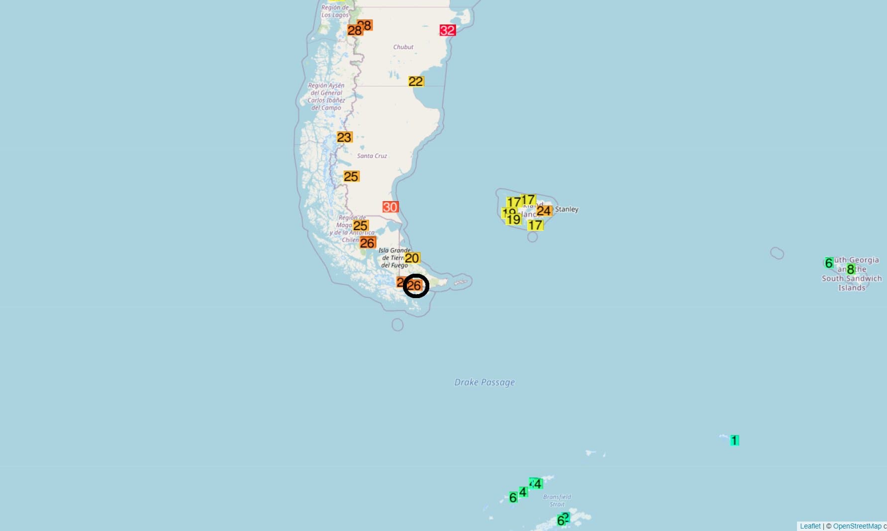 Le 27 février, la Terre de Feu battait également un record absolu de température avec 26.1°C à Puerto-Williams (station la plus méridionale du continent sud-américain). Cette température établi un record tout mois confondu pour cette localité, battant les 26.0°C de décembre 1984.