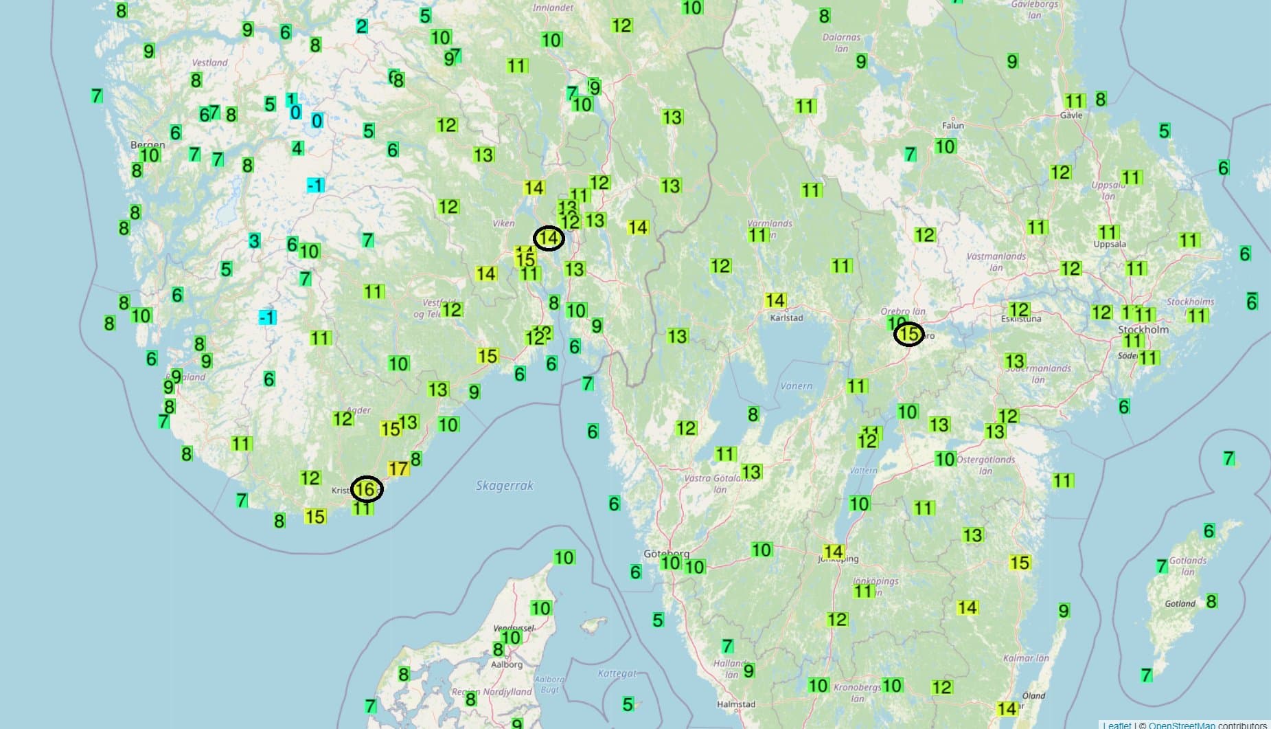 Températures maximales relevées le 28 février sur le Sud de la Scandinavie et records mensuels associés (entourés en noir) – Via Ogimet et twitter : @EKmeteo