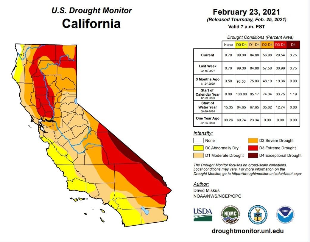 Etat de sécheresse des sols de l’état de Californie à la fin du mois de février  - Via droughtmonitor.unl.edu