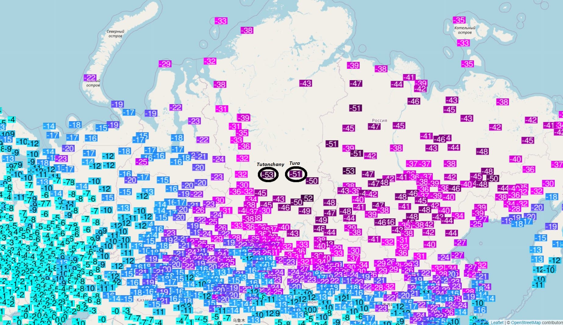 • -53.0°C Tutonchany (ancien record de -51.5°C le 4mars 1978)