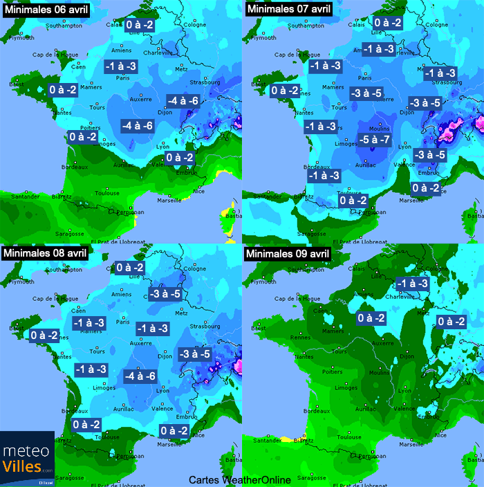 Températures minimales prévues du 6 au 9 avril 2021 - Cartes WeatherOnline