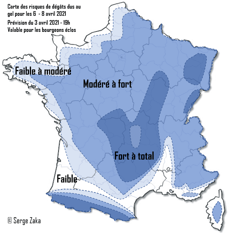 Carte du risque de dégâts du au gel entre le 6 et le 8 avril - Serge Zaka (agroclimatologue)