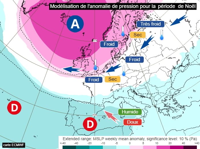 Modélisation de l'anomalie de pression pour la période de Noël 2021 via l'ensembliste européen - via ECMWF