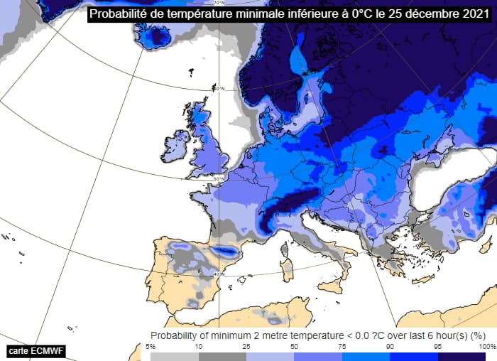 Probabilité d'observer une température minimale inférieure à 0°C à Noël 2021 - via ECMWF