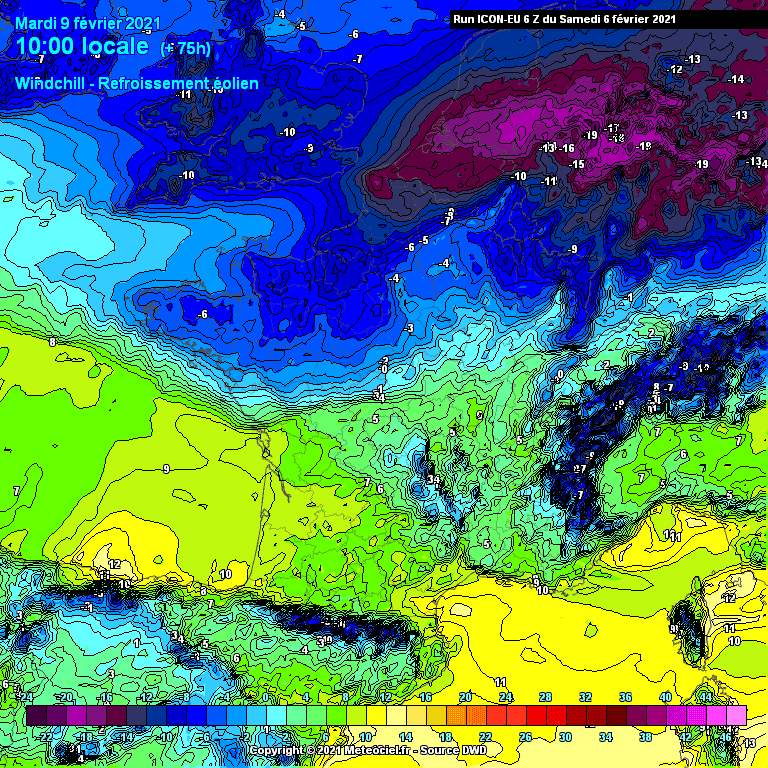 Refroidissement éolien - température ressentie au vent - matinée du mardi 9 février 2021 - Modèle ICON via Météociel