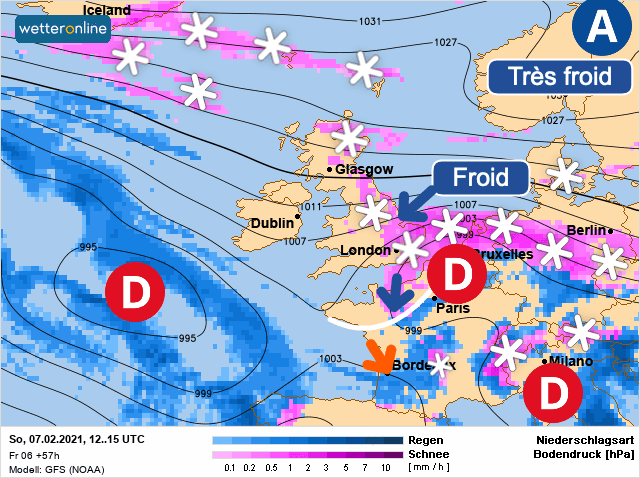 La dépression qui devrait s'isoler autour du bassin Parisien à partir de la nuit de samedi à dimanche se confrontera à de l'air de plus en plus froid venant du cœur du continent européen. Les précipitations, actuellement sous forme liquide ce samedi, prendront dès lors une composante de plus en plus solide au fil des heures.