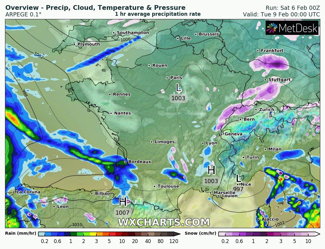 Précipitations (pluie et neige) - journée du mardi 9 février 2021 - Modèle Arpège via WXCharts