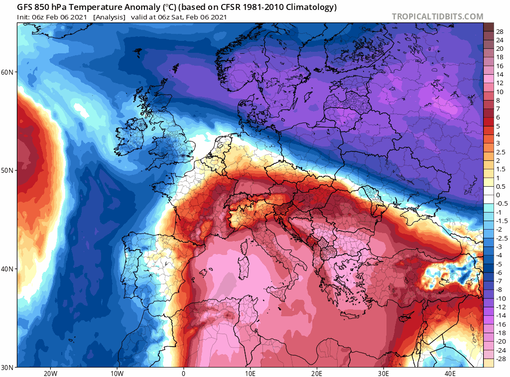 Anomalie de température de la masse d'air à 1500m d'altitude - du 6 au 9 février 2021 - Modèle GFS via TropicalTidbits
