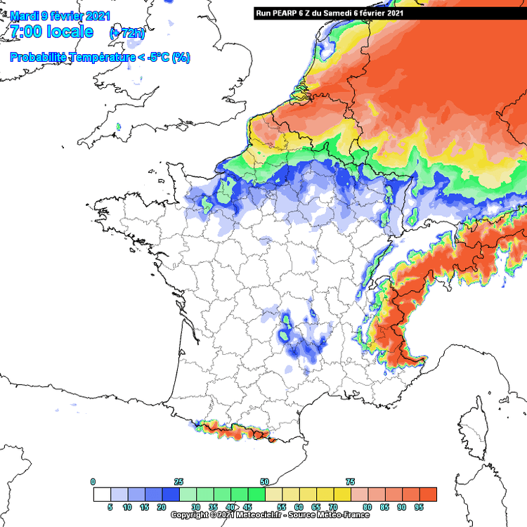 Probabilité de température inférieure à -5°C - matinées du 9 et du 10 février 2021 - Modèle PEArpège via Météociel