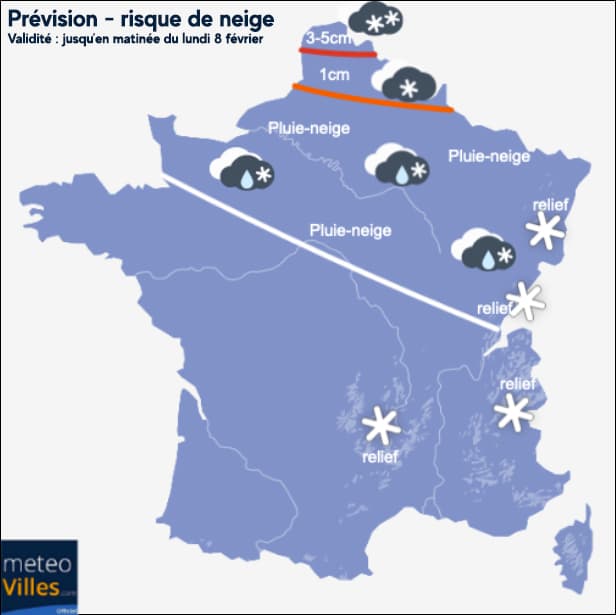Prévision du risque de neige d'ici la matinée du lundi 8 février 2021 - Météo-Villes