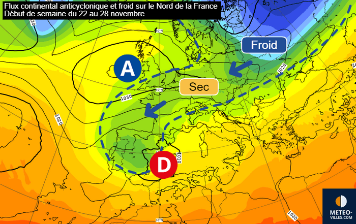 Situation atmosphérique du début de semaine du 22 au 28 novembre 2021 sur l'Ouest de l'Europe - ECMWF, modifié par Météo-Villes