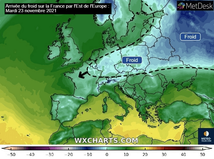 Températures froides se propageant vers la France en début de semaine du 22 au 23 novembre 2021 - Modèle GFS via WX CHARTS