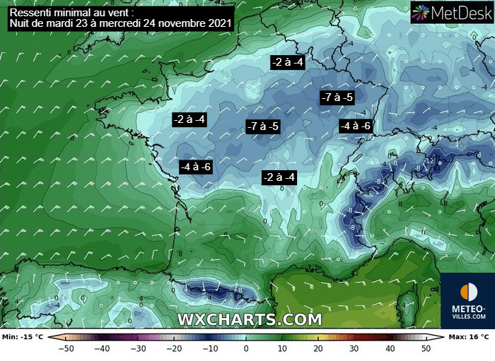 Ressenti au vent minimal attendu pour la nuit du mardi 23 au mercredi 24 novembre 2021 - Modèle GFS via WX CHARTS