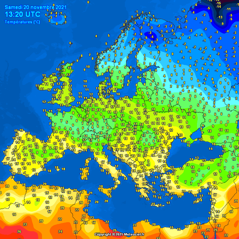 Températures observées ce samedi 20 novembre 2021 sur l 'Europe – Météociel.fr