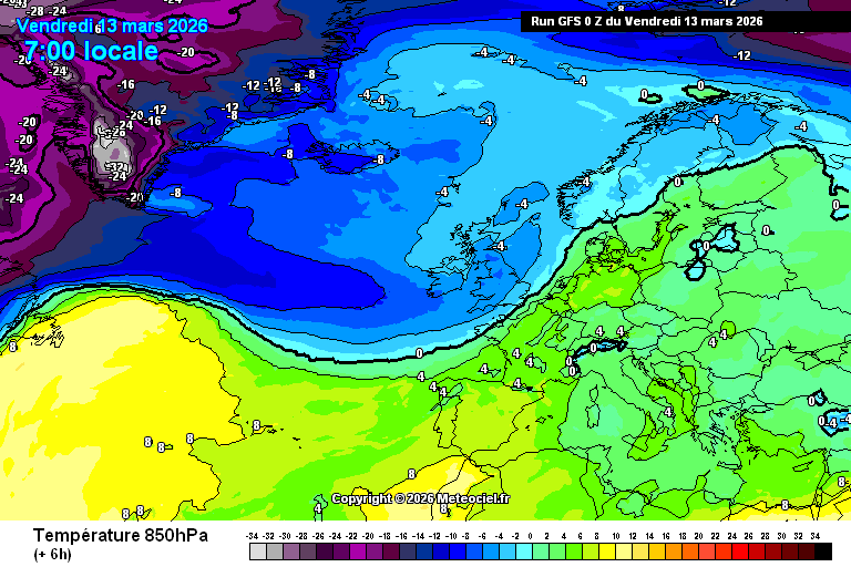 Animation des températures à 850 hPa sur l'Europe du 13 au 16 mars 2026 – Modèle GFS via meteociel