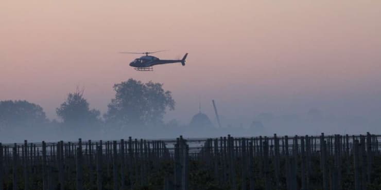 Méthode plus insolite et utilisée par certains viticulteurs : l'hélicoptère ! L'engin est utilisé au dessus des vignes et vole à très basse altitude, permettant de brasser l’air au niveau du sol et ainsi de le réchauffer. Cette méthode, en plus d'être coûteuse, pose des questions environnementales car l'engin est gourmand en kérosène. Néanmoins, elle s'avère efficace.
