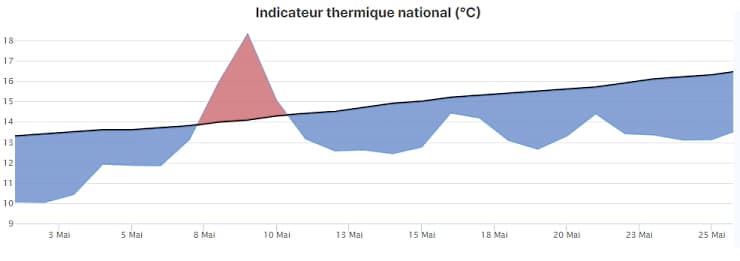 Avec cette influence océanique omniprésente depuis le début du mois, c'est sans surprise que les températures ont été nettement plus fraîches que la normale. L'indicateur thermique national montre un déficit quasiment constant. Seules les journées du 9, du 10 et du 11 mai ont enregistré des températures supérieures aux normales. Sur les 26 premiers jours de mai, la température moyenne en France fut de 13,11°C, représentant un déficit thermique de 1,7°C.