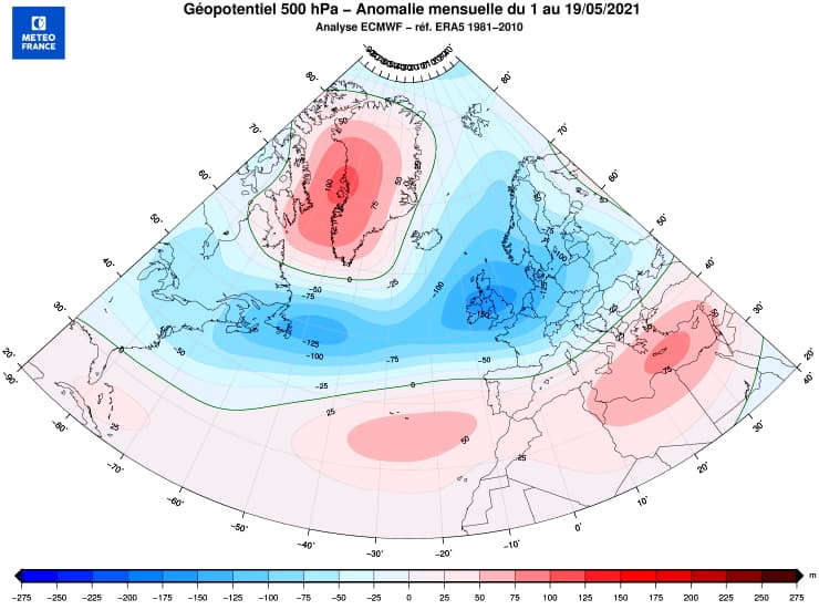 L'anomalie de géopotentiel sur les deux premiers tiers du mois de mai 2021 permet de mettre en évidence l'omniprésence des basses pressions de Terre-Neuve jusqu'à la Scandinavie. C'est sur les Îles Britanniques que cette anomalie fut la plus prononcée, influençant directement la France en maintenant un flux océanique durable (flux oscillant entre le secteur nord-ouest et le secteur sud-ouest). Les hautes pressions, quant à elles, ont été trop reculées vers les Açores, le nord de l'Afrique et l'est du bassin méditerranéen.