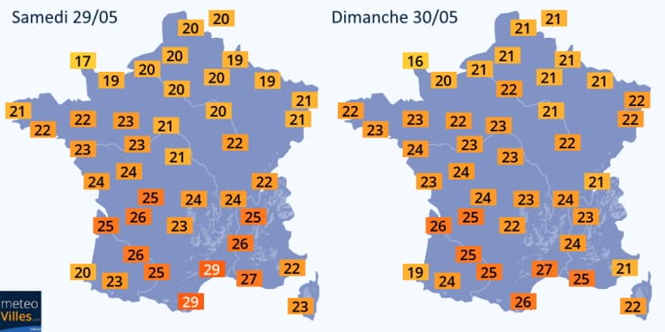 Températures maximales prévues les samedi 29 et dimanche 30 mai 2021 - Météo Villes