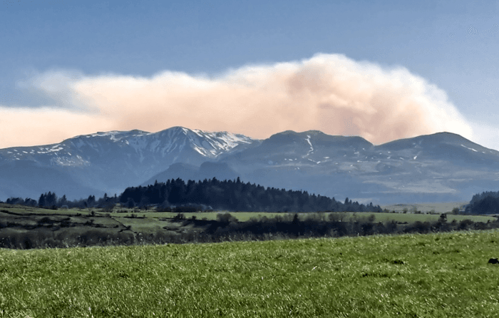 L'incendie s'est déclaré en après-midi du lundi 7 avril 2025. Il a touché le sommet du Puy Redon, situé sur la commune de Chastreix dans le département du Puy-de-Dôme. À la faveur d'un air sec et d'un petit vent continental, les flammes ont rapidement progressé sur les pentes de la montagne, détruisant plusieurs dizaines d'hectares en quelques heures. La photo ci-dessous, montrant l'imposant panache de fumée, permet de prendre la mesure de l'ampleur du brasier.
