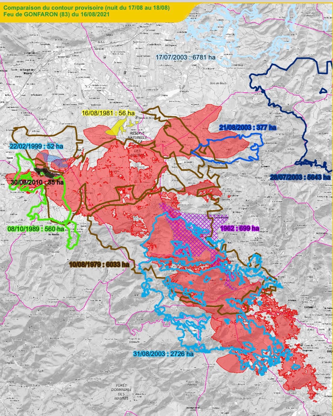 Il s'agit officiellement du feu le plus étendu en France métropolitaine depuis 31 ans, et les grands feux de la fin de l'été 1990... ayant déjà touché le département du Var et ce même massif des Maures. Car en effet, le département du Var possède une très grande surface végétative (58,3 % de sa superficie est boisée, représentant plus de 350.000 hectares). Massifs de la Sainte-Baume, des Maures, de l'Estérel, du Haut-Var ou encore des Monts Toulonnais, tous sont extrêmement exposés au risque d'incendie.