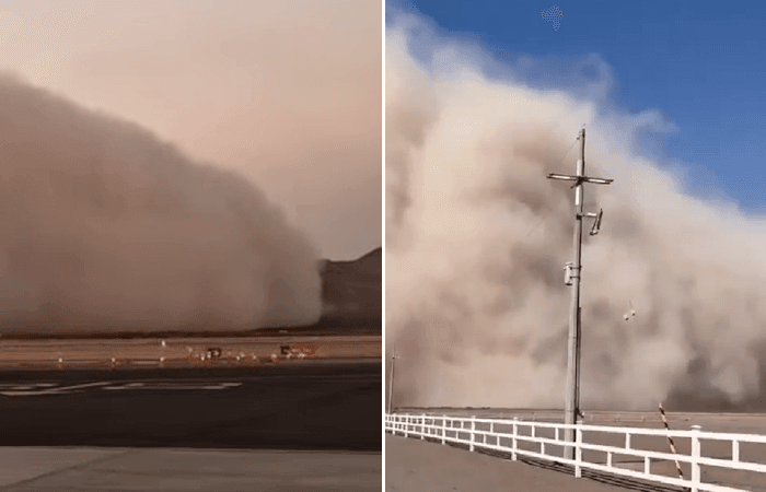 Vu du sol, la tempête de sable était encore plus terrifiante. Les images ci-dessous ont été prises depuis le tarmac de l'aéroport de la ville de Chihuahua, capitale de l'État mexicain du même nom. On observe une gigantesque vague de sable s'apprêtant à engloutir l'aéroport. Bien évidemment, ce dernier a dû être fermé durant la tempête, à cause d'une visibilité rendue quasi-nulle.