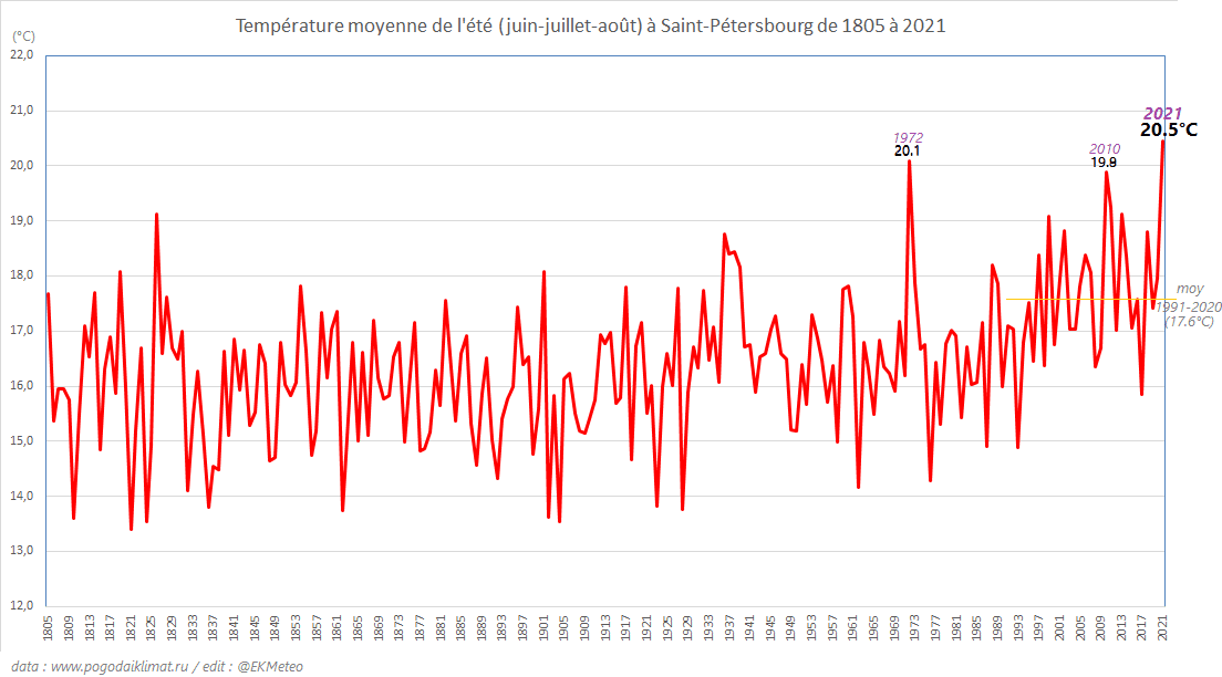 Température moyenne de l'été (juin/juillet/août) à Saint-Pétersbourg depuis 1805 – Via twitter @Ekmeteo