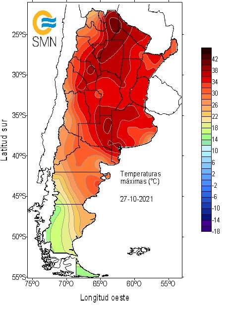 Températures maximales le 27 octobre 2021 sur l'Argentine – SNM Argentina